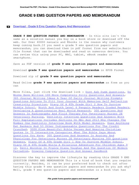 | File Name: Grade 9 Ems Question Papers And Memorandum.pdf Size: 7483 KB Type: PDF, ePub, eBook |